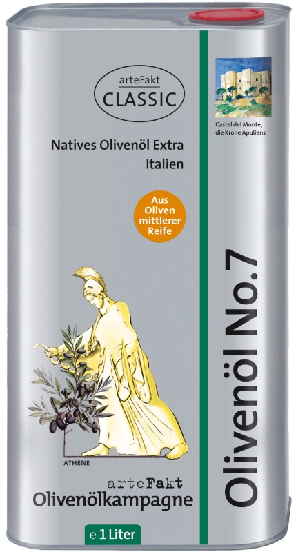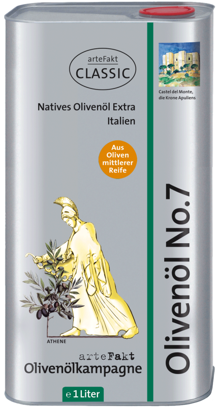 Die abgefüllten Olivenöle in allen Gebinden der Cooperative Emanuele De Deo unterscheiden sich nicht im Inhalt. Der 0,5 L Kanister des Olivenöls No.7 fruchtig hat lediglich ein vom 1 Liter-Kanister abweichendes Design, weil der Ertrag dem Unterhalt des Patenschafts-Olivenhain „Palombaio No.1“ bzw. seiner Weiterentwicklung zu einem Landschaftsmuseum zugute kommt.