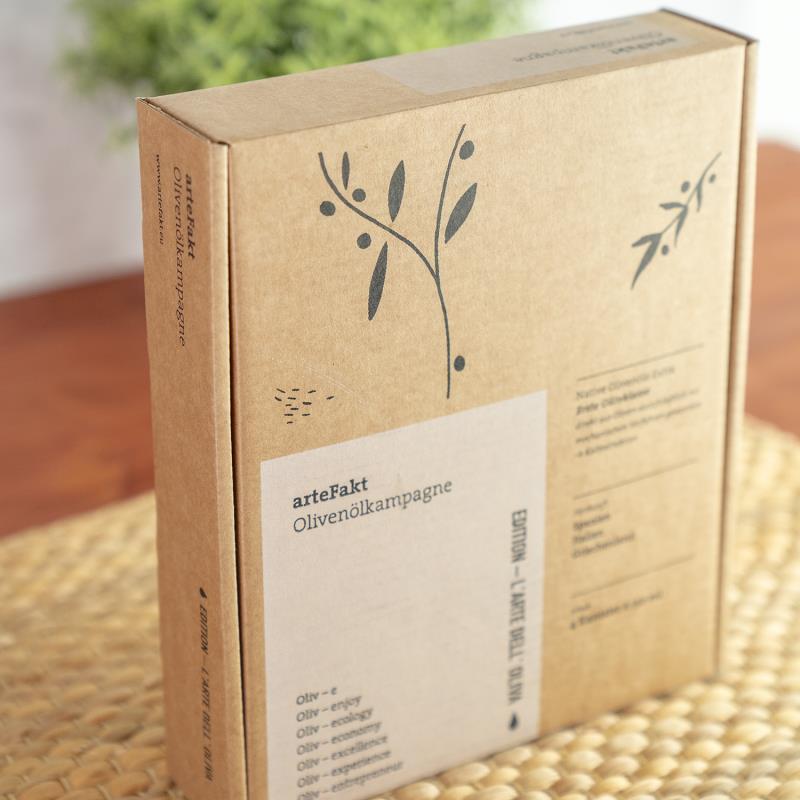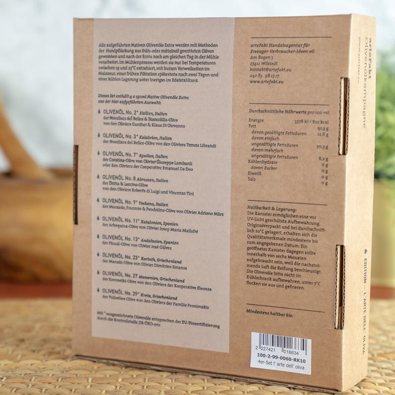 Das Probier- und Geschenkset enthält 4 Olivenöle. Dazu die Olivenpässe als Karten in Schmuckversion.