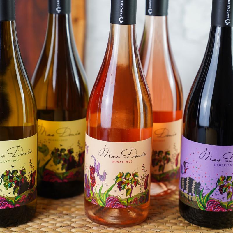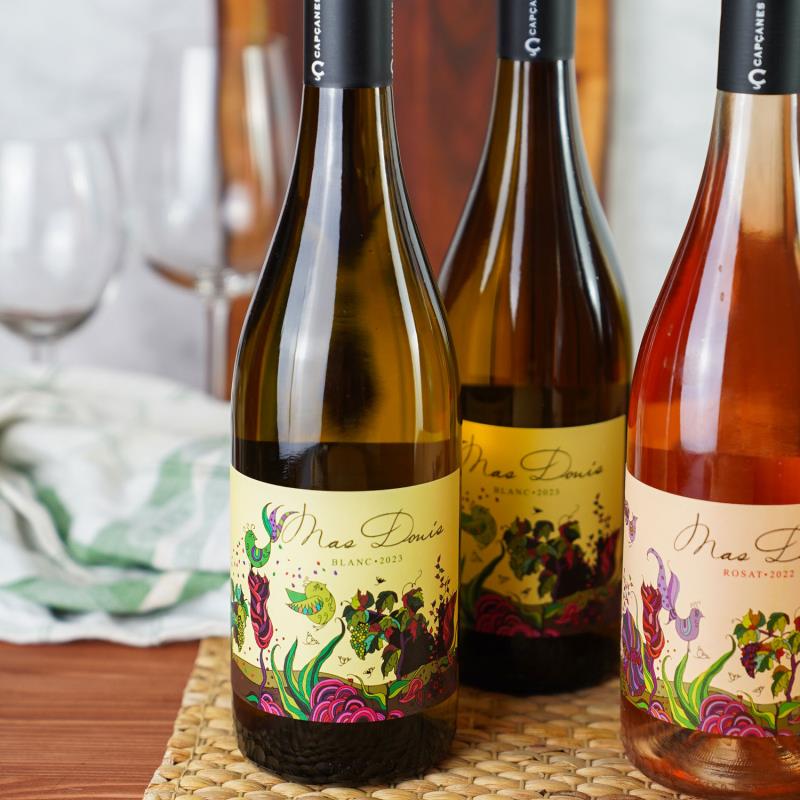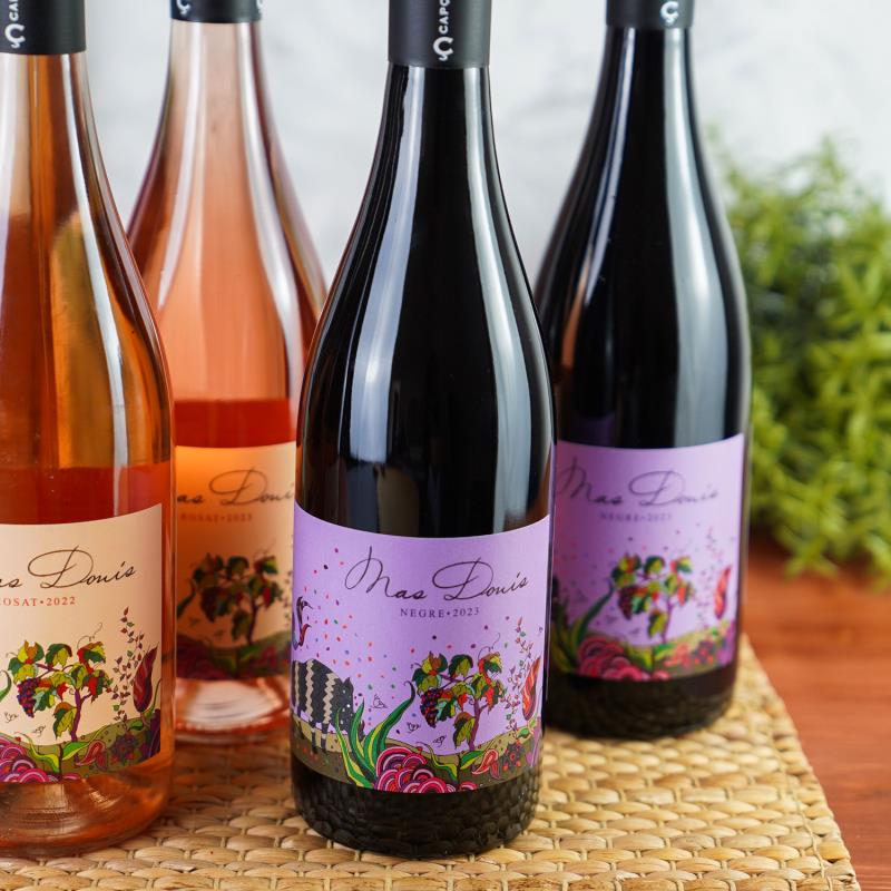je 2 Flaschen Mas Donis weiß, 2 Flaschen Mas Donis rosé und 2 Flaschen Mas Donis rot.