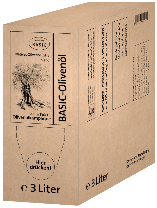 Das arteFakt basic-Olivenöl ist eine Cuvée, die vorwiegend aus der Arbequina- und der Koroneiki-Olive gewonnen wird, die von unseren Oliviers der Kooperative ELEONAS vom Peloponnes und Josep Maria Mallafré aus Katalonien stammen.