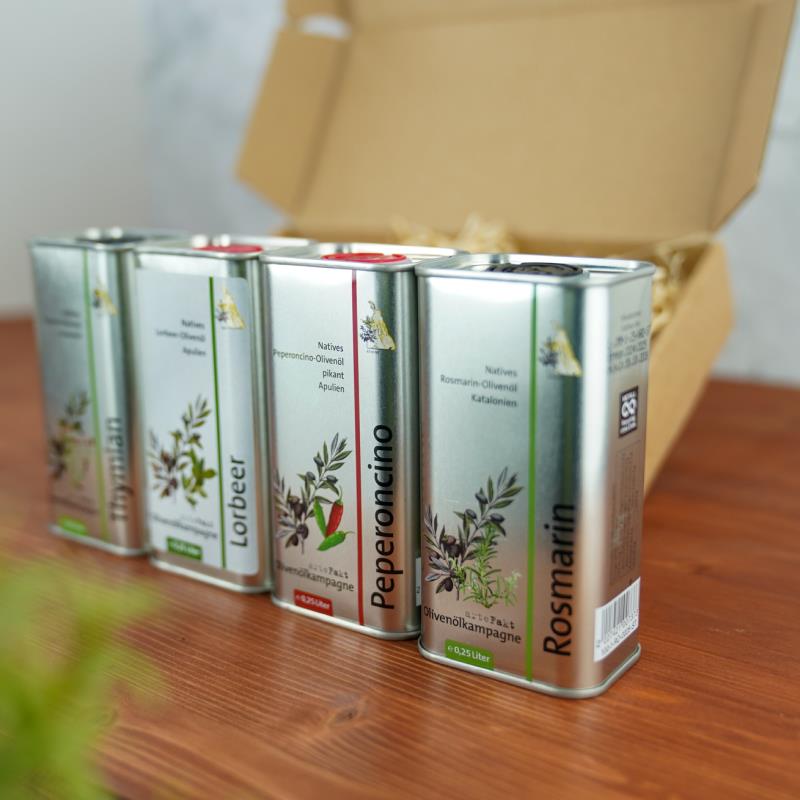 Das Set enthält 4 natürlich aromatisierte Olivenöle im Geschenkkarton.