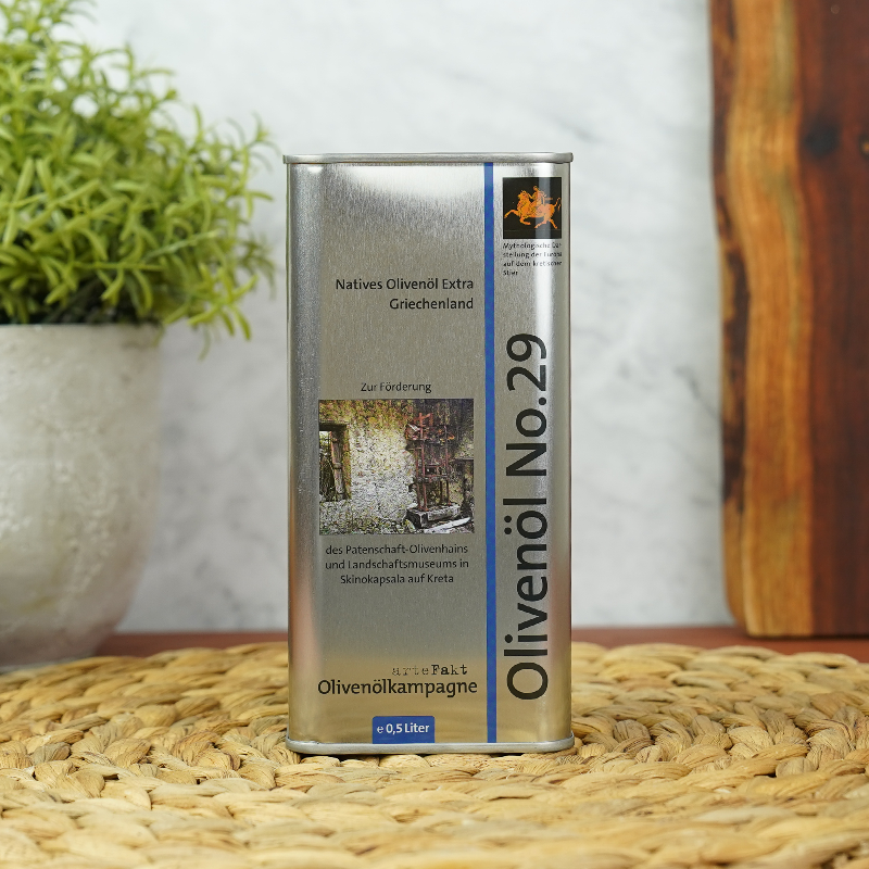 Die abgefüllten Olivenöle in allen Gebinden der Familie Fronimakis unterscheiden sich nicht im Inhalt. Der 0,5 L Kanister des Olivenöls No.29 hat lediglich ein vom 1 Liter-Kanister abweichendes Design, weil der Ertrag dem Unterhalt des Patenschafts-Olivenhain „Skinokapsala“ bzw. seiner Weiterentwicklung zu einem Landschaftsmuseum zugutekommt.