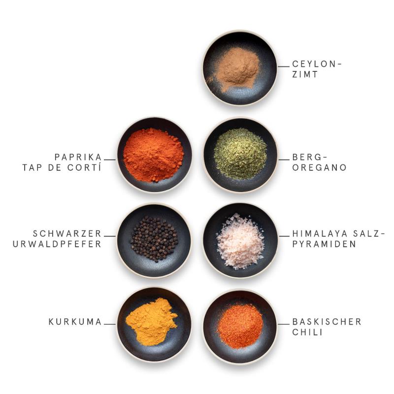 Der Einstieg in die Welt der Gewürze oder als Geschenk für neugierige Freunde und Bekannte. Enthalten sind 7 Probiertüten unserer beliebtesten Gewürze und 6 passende Rezepte. (Berg-Oregano, Paprika Tap de Cortí, Ceylon-Zimt, Baskischer Chili, Schwarzer Pfeffer, Himalaya-Salz-Pyramiden, Kurkuma)