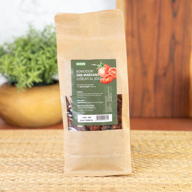 Diese San Marzano-Tomaten erster Wahl aus Apulien werden auf natürliche Weise in der Sonne getrocknet, um ihre organoleptischen Eigenschaften besser zu erhalten und sind ideal, um Ihren Gerichten eine zusätzliche würzig aromatische Note zu verleihen. Außerdem sind die getrockneten Tomaten von Onggi perfekt dafür geeignet, um schmackhafte Pasteten, Cremes und Pesti herzustellen, z.B. in Kombination mit unserem nativen Peperoncino-Olivenöl feurig, Knoblauch, Walnüssen und Cashewkernen.