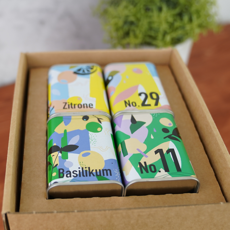 Im Paket enthalten sind zwei von unseren beliebtesten nativen Olivenölen: Das native Bio-Olivenöl No. 11 fruchtig der Familie Mallafré aus Katalonien und das native Olivenöl No.29 der Familie Fronimakis. Zusätzlich mit enthalten sind zwei tolle natürlich aromatisierte native Olivenöle aus unserem Sortiment: das Basilikum-Olivenöl und das Zitrone-Olivenöl, beide aus Katalonien. In der Geschenkbox enthalten sind außerdem eine Pesto-Fibel mit Rezeptideen für die leckere 5-Minuten Küche und eine Brochüre über Olivenöl und Gesundheit.