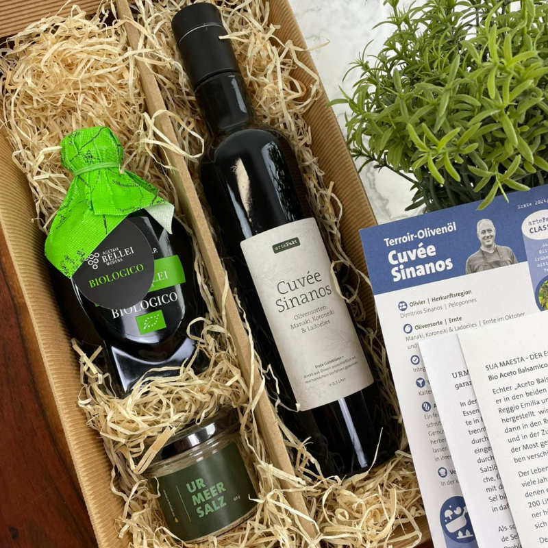 Inhalt: 0,5 Liter Flasche natives Olivenöl extra "Cuvée Sinanos", 250 ml Balsamico "Sua Maestá", 60 g Glas grobkörniges Urmeersalz.