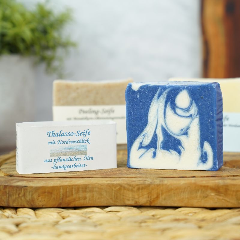 Thalasso-Seife mit Nordseeschlick und Nordseewasser. Die mineralreichen Inhaltsstoffe erinnern an Anwendungen aus der Meerespflege und sorgen für eine belebende Reinigung mit leichtem Peelingeffekt.