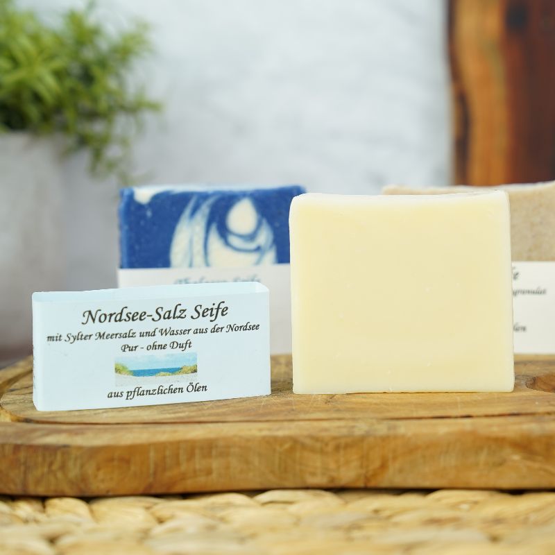 Nordsee-Salz-Seife mit echtem Sylter Meersalz, gewonnen aus Nordseewasser. Die Seife reinigt sanft und versorgt die Haut mit Feuchtigkeit.