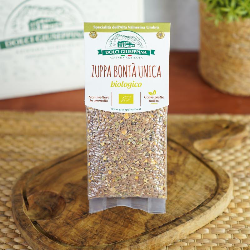 „Bontà Unica“ und „alla Trebua“ - zwei Bio-Suppenmischungen aus Getreide und Hülsenfrüchten, zusammengestellt von Giuseppina Dolci