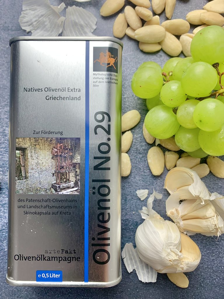 - Mandeln, gezupftes Weißbrot, 1/2 TL Salz, Wasser, Knoblauch mischen und sehr fein pürieren (im Blender oder mit dem Pürierstab). Olivenöl und Sherry dazugeben und ganz kurz untermixen. Sie Suppe bis zum Servieren kalt stellen.*