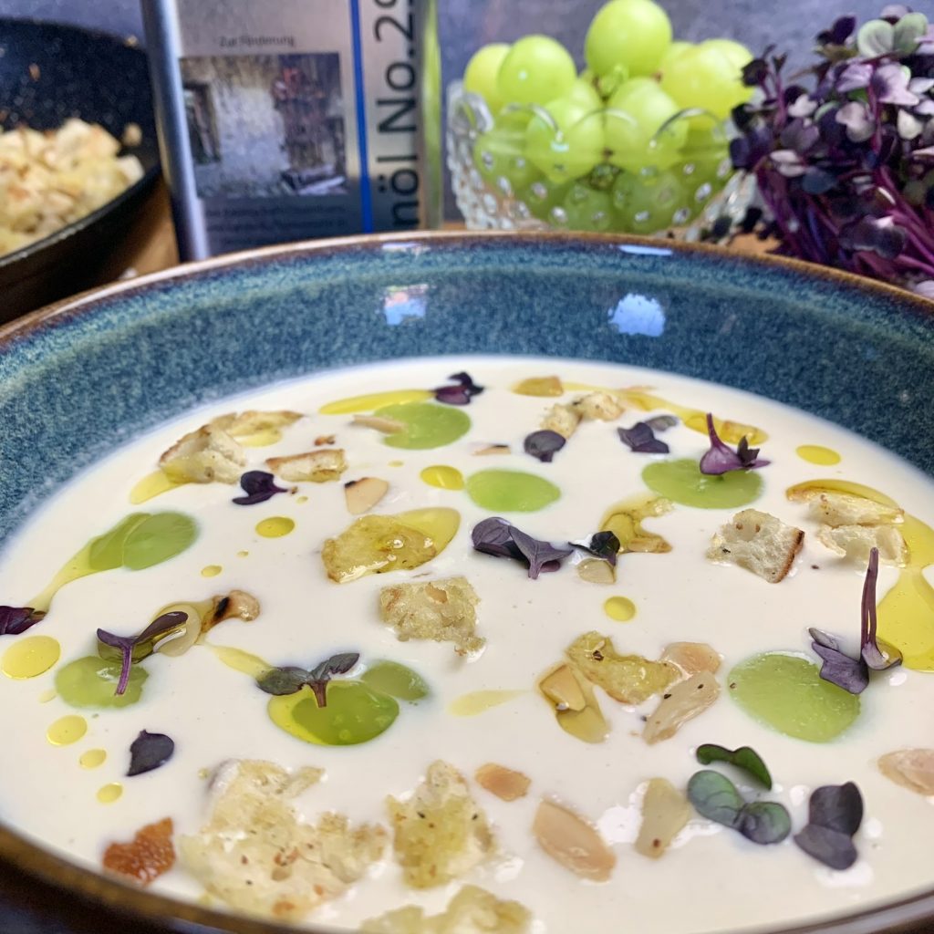 Ajo Blanco – was für ein Geschmackserlebnis! Diese kalte, cremige Mandelsuppe aus Andalusien ist einfach himmlisch. Fein gemahlene Mandeln, Knoblauch, Weißbrot, Olivenöl und ein Hauch Sherry verschmelzen zu einer erfrischenden Köstlichkeit. Franzi Licht krönt dieses kühlende Sommergericht mit süßen Trauben, knackigen Mandel-Croutons und Kresse. So schlicht, so raffiniert, so unglaublich gut!