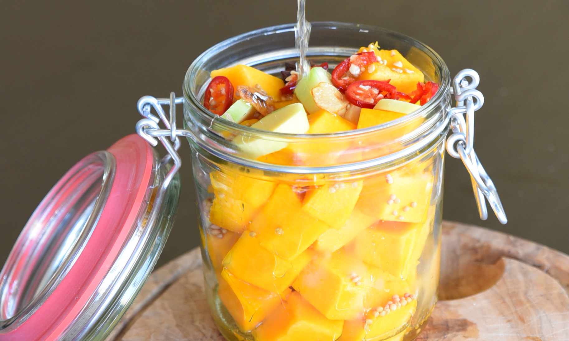 - Den Muskatkürbis halbieren, entkernen und schälen. Das Fruchtfleisch in ca. 3 x 3 cm große Stücke schneiden. In Weckgläser füllen. Den Ingwer schälen, in Scheiben schneiden und ebenfalls in die Gläser verteilen. Sternanis und die in Ringe geschnittene Peperoni mit den Kernen und die Senfkörner ebenfalls ins Glas geben.