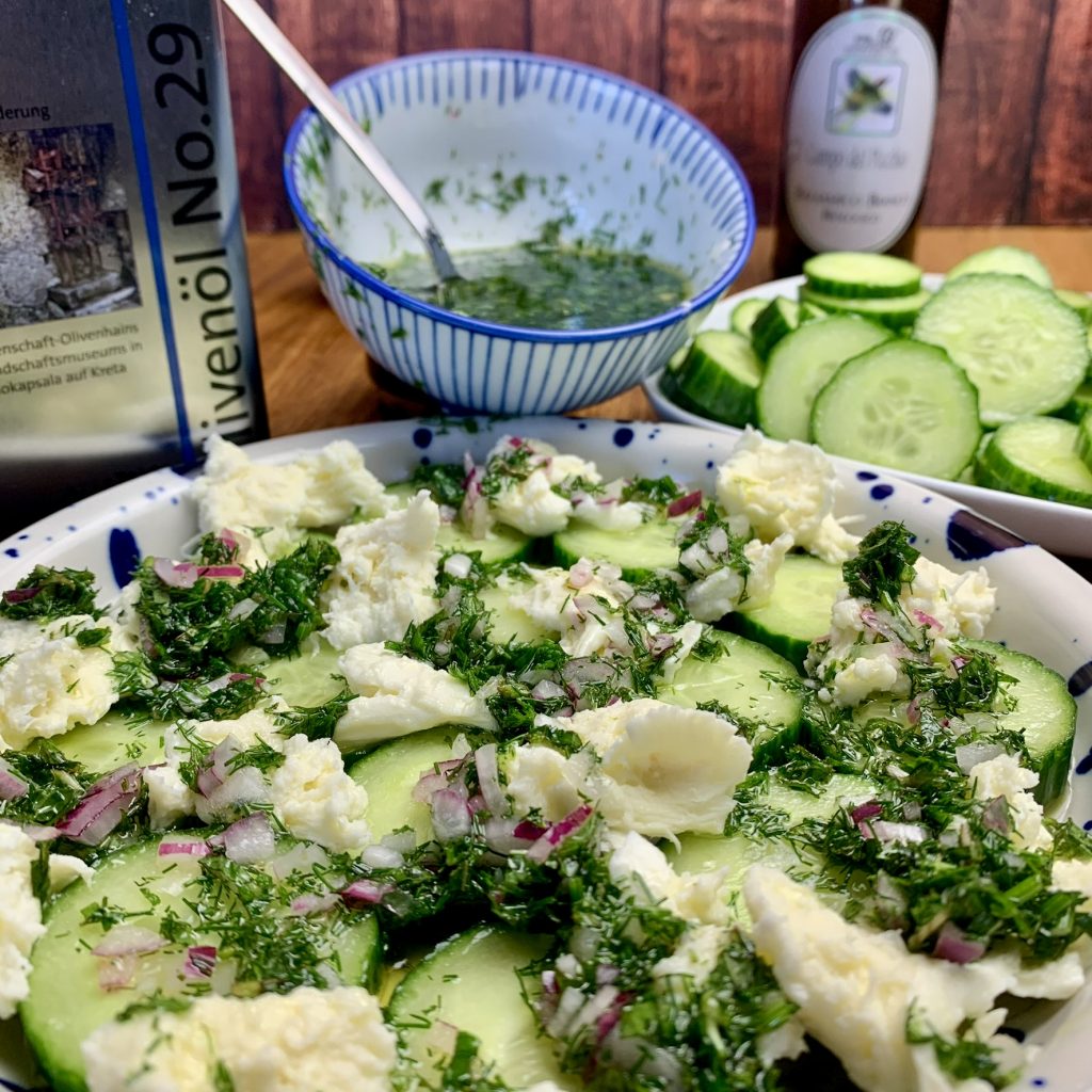 Caprese mit Tomaten kennt ja jeder, aber Mozzarella ist unglaublich vielseitig und schmeckt auch perfekt zu knackiger grüner Gurke. Minze und Dill und Gurke sind Aromen, die fantastisch mit diesem griechischen Olivenöl harmonieren. Vor allem im Sommer ist diese Variation toll. Sie ist zum einen genauso köstlich und schnell zubereitet, wie ihr klassisches italienisches Vorbild und zum anderen herrlich erfrischend, hydrierend und kühlend für unseren Körper.