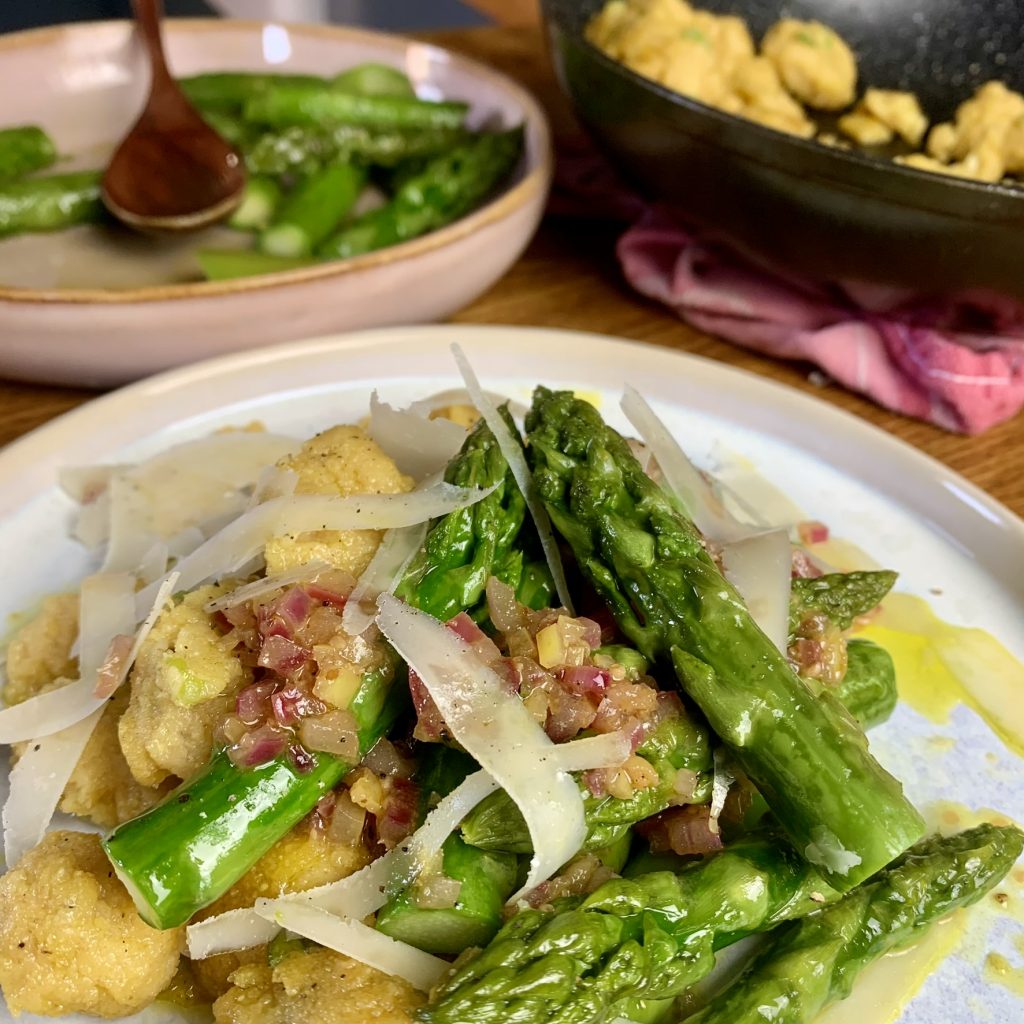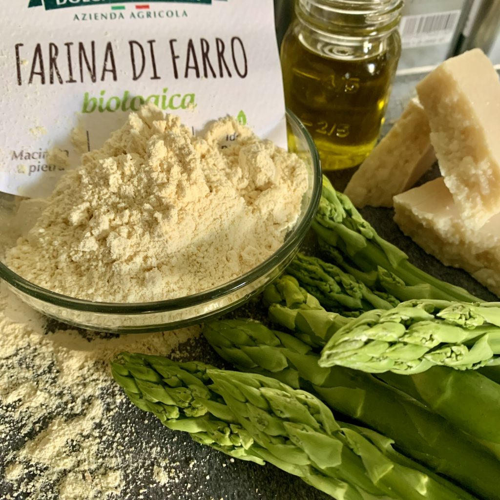 Das Kichererbsenmehl und Dinkelmehl von Dolci Guiseppina eignen sich perfekt für Pfuffer oder Pfannkuchen, die ganz ohne Ei auskommen sowie Fallafel oder auch herzhaftes Gebäck. Franzi Licht kombiniert hier das Kichererbsenmehl „Farina di Cecci“ mit ein wenig Dinkelmehl „Farina di Farro“ mit Wasser für ein veganes „Rührei“ (engl. Scrambled Eggs) bzw. mit dem herrlich aromatisierten Olivenöl No.11 grün und knackigem Grünen Spargel und würzigen Parmesanspänen.