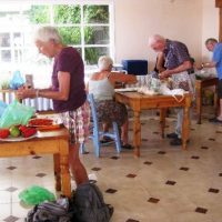 Im Hotel zurück, werden sie eineinhalb Stunden in improvisierter Brühe weich gekocht. Anschließend im öl Nr. 29 von Edith und Jannis Fronimakis scharf angebraten und mit feingeschnittenen Gemüse vermischt und gewürzt. Umgeben von den 11 anderen Hobbyköchen, die ein wenig aufgeregt miteinander kochen, bereiten wir einen wohlschmeckenden Salat zu.