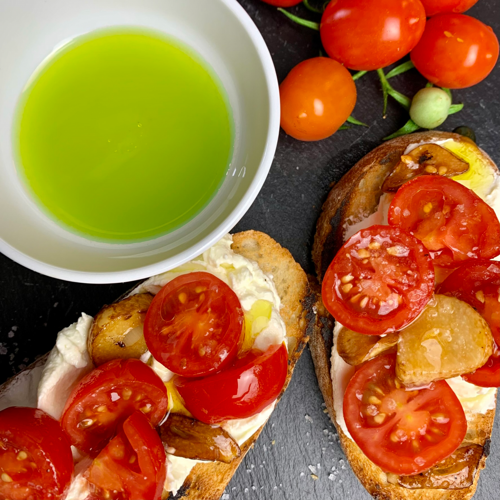 - Tomaten und Knoblauch auf den Ricotta geben, das Primario darüber träufeln und alles mit einem Hauch frischem Pfeffer und Meersalz würzen.
