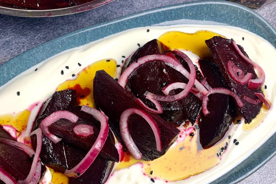 Rote Bete mit Baharat, Joghurt, Olivenöl No.13 und eingelegten Zwiebeln
