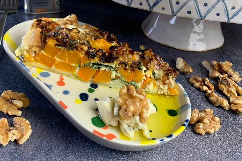Kürbis-Spinat-Quiche mit Orangenolivenöl und Gorgonzola