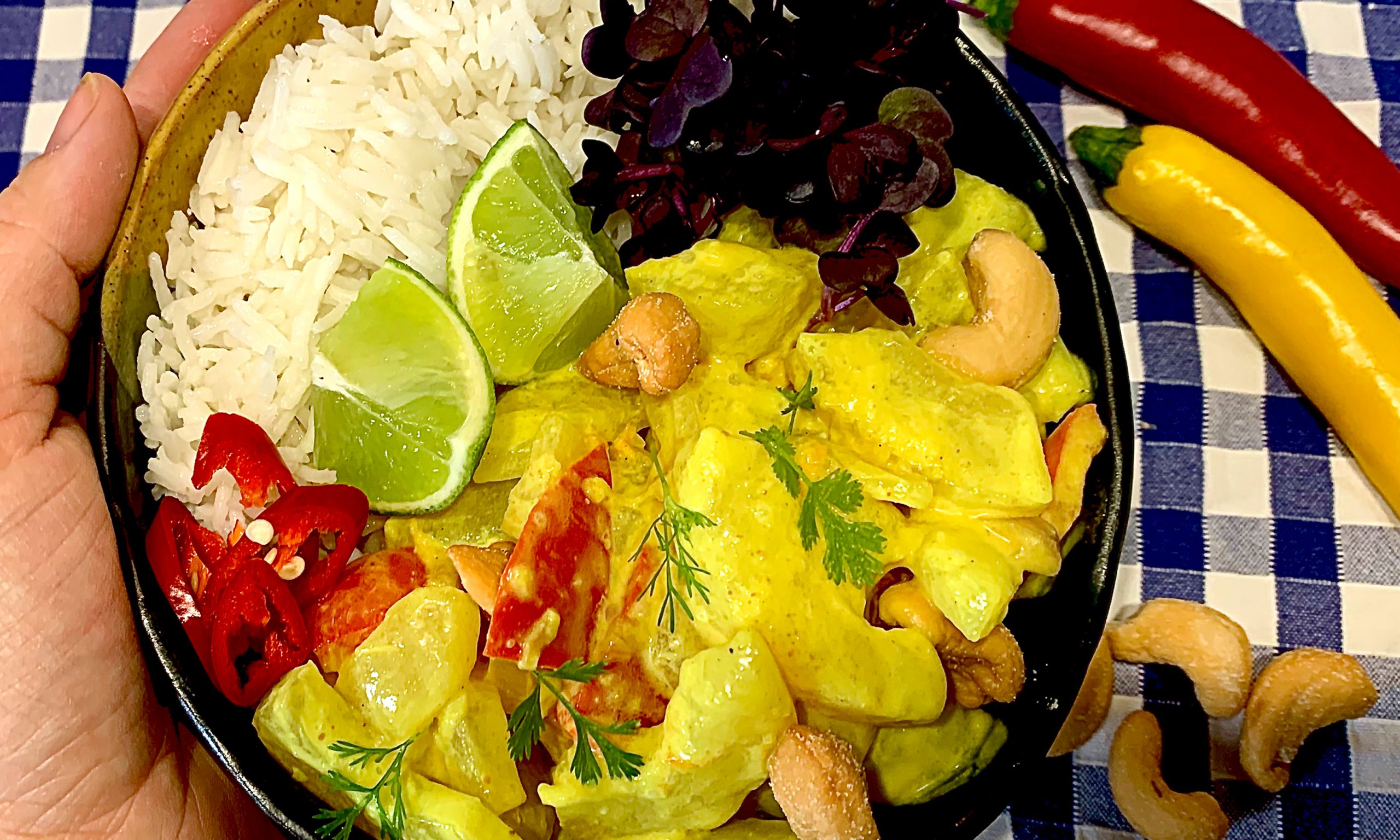 Dieses einfache Curry ist cremig und mild, daher unbedingt gehackte Chilli, Koriander und Limetten dazu servieren, so kann jeder selbst würzen und es schmeckt schön frisch. Die Cashewkerne sind angenehm knackig, man könnte sie auch gegen Erdnüsse tauschen. Dazu passt gedämpfter Reis.