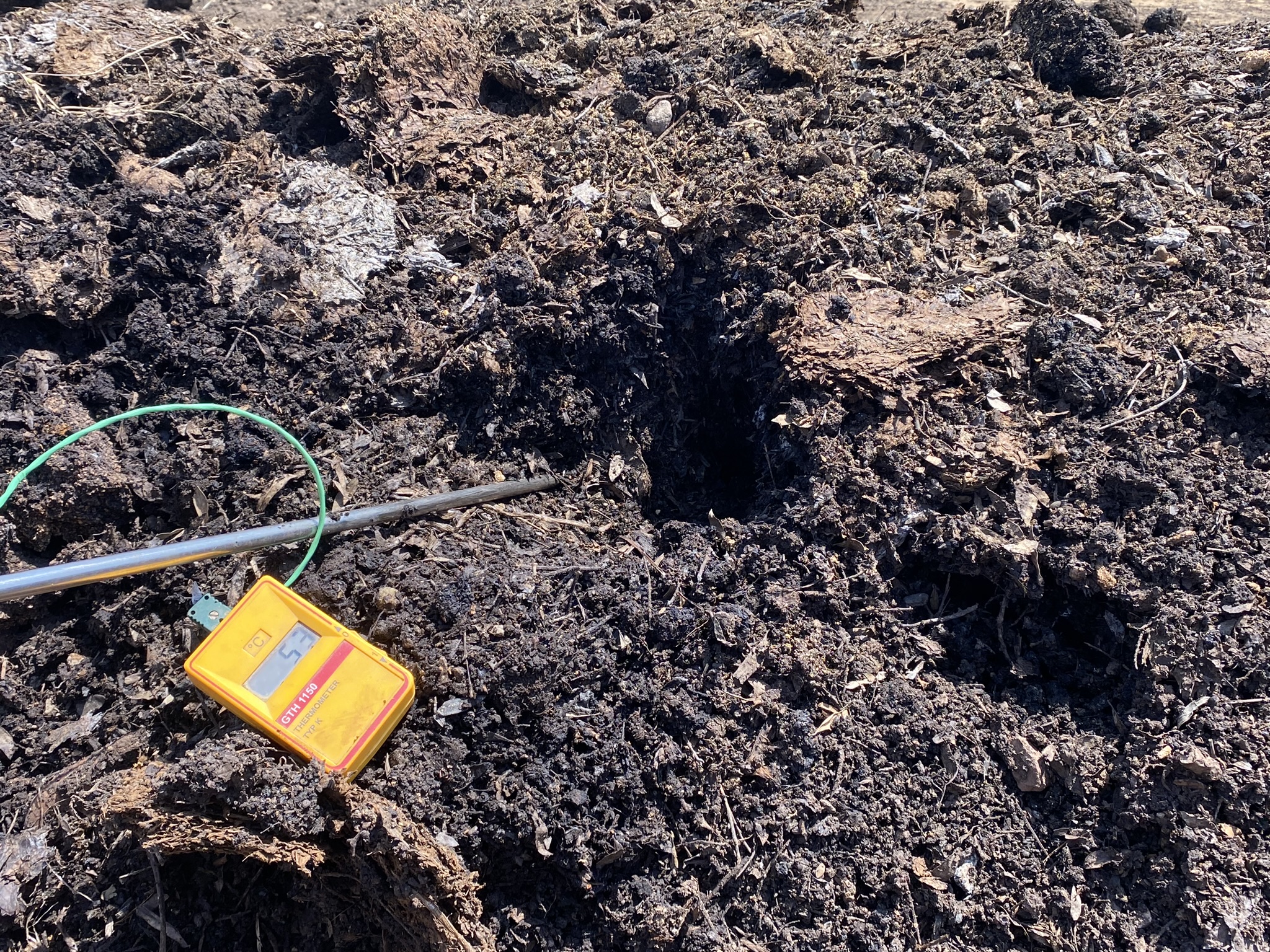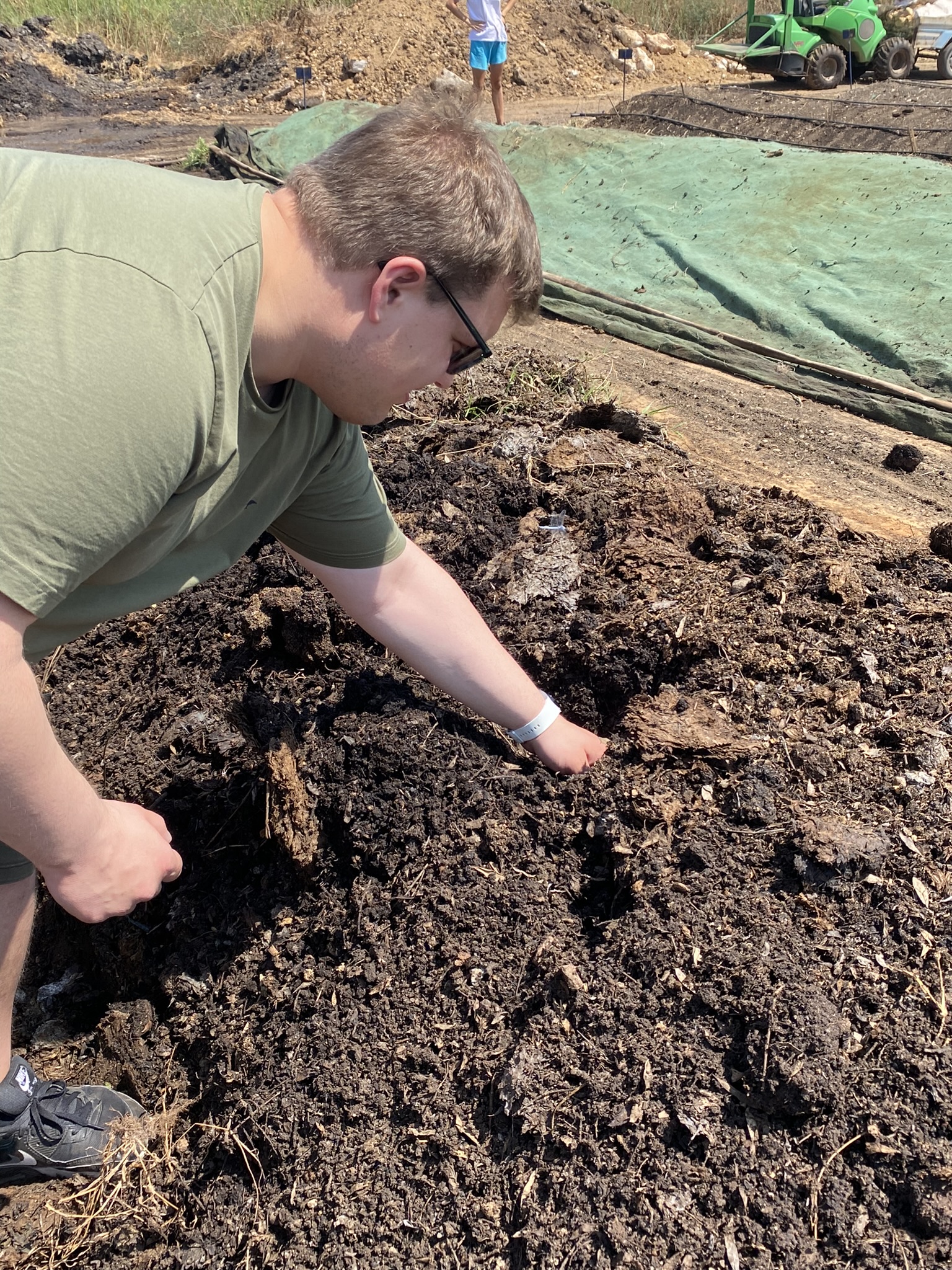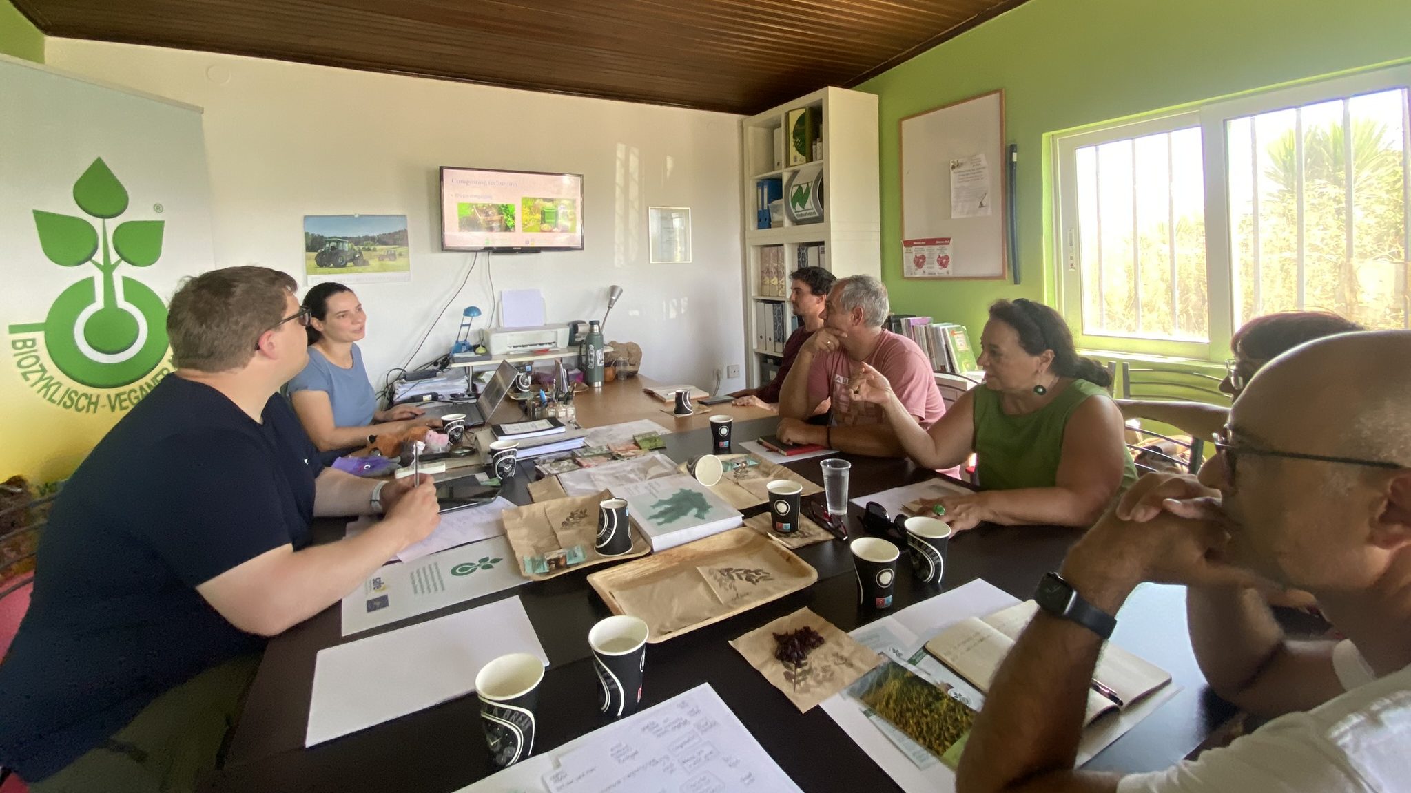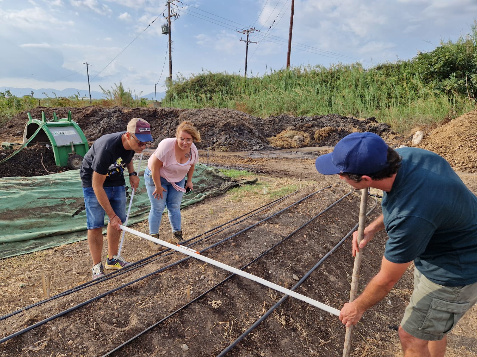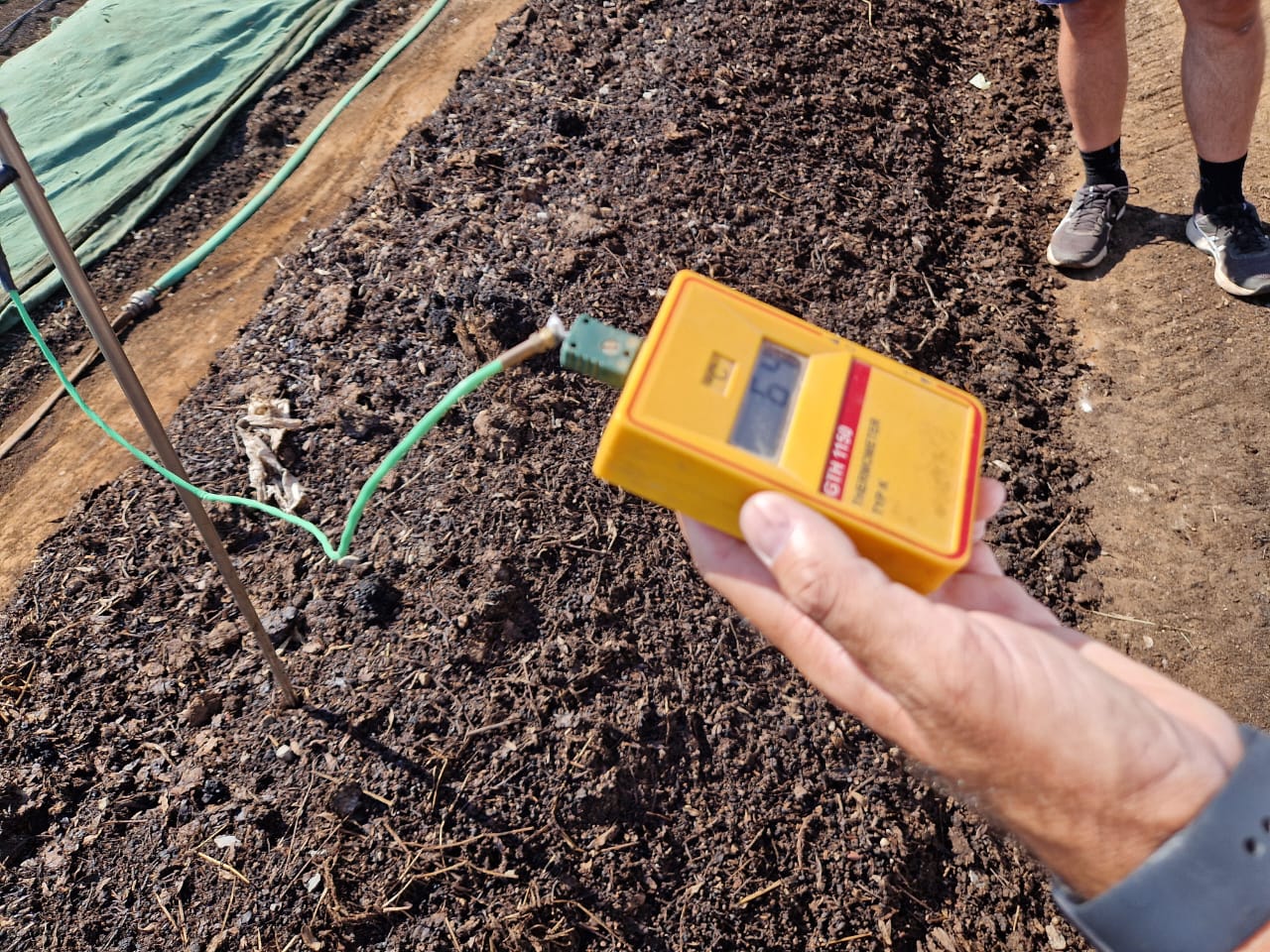 Nach der Mittagspause folgt ein weiterer Theorieblock, in dem wir lernen, anhand welcher Parameter der optimale Zeitpunkt zum Wenden des Komposthügels bestimmt wird. Daran kann man auch feststellen, ob die organische Masse noch Kompost oder bereits PCS bzw. Humus-Erde geworden ist. Am nächsten Seminartag messen wir dann verschiedene Parameter wie Temperatur, Feuchtigkeit und den CO2-Gehalt des von uns angelegten Komposthügels. Diese Messungen dienen vor allem dem Lernen, denn schon ein kurzer Griff in den Kompost zeigt, dass die Hitzeentwicklung so stark ist, dass man sich fast die Hand verbrennen könnte. Es ist ein klares Zeichen dafür, dass wichtige Nährstoffe schnell verloren zu gehen drohen. Aufgrund dieser Aktivität im inneren des Komposthügel muss dieser dann gewendet werden, was zum Absenken der Temperatur und zum Verlangsamen des Kompostierungsprozesses führt. Das ist zeitaufwendig und macht schnell deutlich, dass es einen Olivier auch herausfordern würde. Neben der Neuanschaffung erforderlicher Maschinen muss er seine bisherige nur auf die Oliven ausgerichtete Landwirtschaft und Arbeit neu organisieren, was nicht eben mal schnell nebenbei gemacht werden kann.