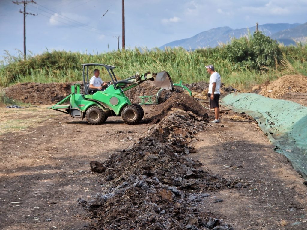 Im anschließenden praktischen Teil des Workshops arbeiten wir direkt mit organischem Material wie Oliventrester, Olivenblätter, Weintrester, Pilzresten und Stroh. Wir lernen mit ihnen die richtige Kohlenstoff-Stickstoff-Balance für Kompost zu erreichen und vermengen die Materialien zu einem Kompost-Hügelbeet. Für das tägliche oder auch mehrmalige Wenden des Hügels in der ersten Kompostphase, braucht es Spezialmaschinen, um eine effiziente Mischung und den Ablauf der inneren Prozesse zu gewährleisten.