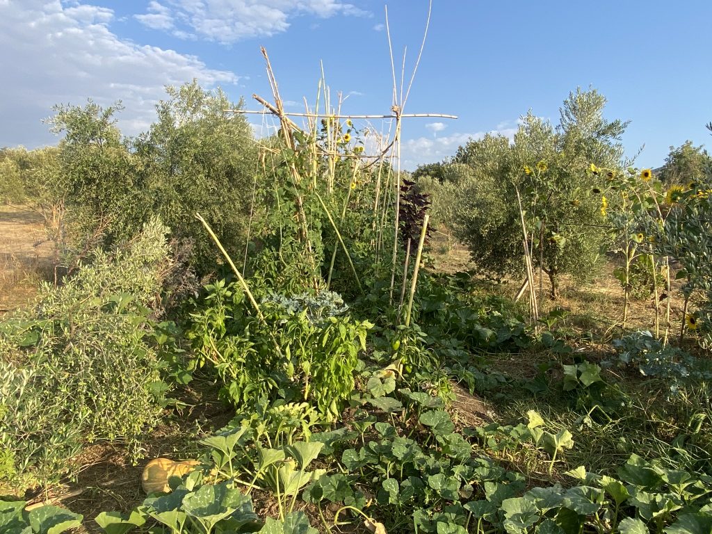 Als nächstes fahren wir zu einer nahegelegenen Farm, wo ein Ehepaar im Frühjahr zwischen ihren Olivenbäumen ein PCS-Hügelbeet angelegt hat. Möglicherweise so, wie wir es auch für unsere Experimente vorhaben und machen könnten. Wir beobachten, dass die dort auf den Hügelbeeten wachsenden Pflanzen und Früchte üppig und beeindruckend groß wachsen und auch die umstehenden Olivenbäume besser aussehende Oliven tragen. Möglicherweise sind das aber auch nur Mitnahmeeffekte, die sich aus der Bewässerung der Hügelbeete ergeben. Andererseits fungiert Humuserde nicht wie herkömmlicher Humus aus der Verrottung oder der Wurmzucht mit auch tierischen Exkrementen nicht als Schwamm der Wasser speichert. Humuserde fördert die Vielfalt über und unter der Erde mit einer lebendigen Welt der Mikroorganismen und der Pflanzenvielfalt für ihr synergetisches Zusammenwirken der Selbstversorgung des Kreislaufes ihrer Ernährung und ihres Schutzes. Seit über zwanzig Jahren treibt Johannes die Frage um wer eigentlich die Erde gedüngt hat bevor es uns Menschen gab. Ebenso lange erforscht er mit der Entwicklung der Humuserde und der Art ihrer pflanzlichen Bewirtschaftung eine Antwort darauf zu finden. Schaut man sich auf seinem Versuchsgelände die über die vielen Jahre seiner Forschung angelegten Hügelbeete mit ihrem üppigen Bewuchs an, und dass er sie noch nie gedüngt hat, dann spricht einiges dafür, sich näher damit zu befassen, auf unserem Weg der Suche dem Klimawandel trotzen zu können.