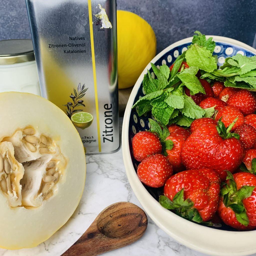 Olivenöl eignet sich toll um auch süße Speisen zu verfeinern und bekannten Klassikern eine aromatische und spannende neue Richtung zu geben. In diesem Rezept kombiniert Franzi Licht eine luftige Joghurtmousse mit einem feinen kleinen Salat aus frischen Früchten, Minze und Zitronenolivenöl.